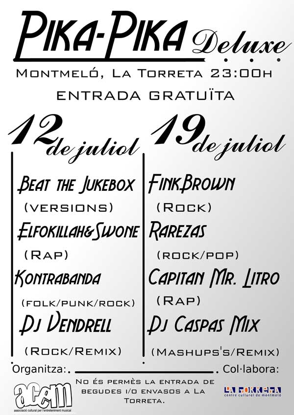 Dos divendres de 4 horetes llargues de fiestuki gratix i al poble... Â Amb ganes de que arribin les Sessions de Pika-Pika deluxe!! divendres 12/07 i 19/07 4 grups d'estils diferents, a la fresca y ...