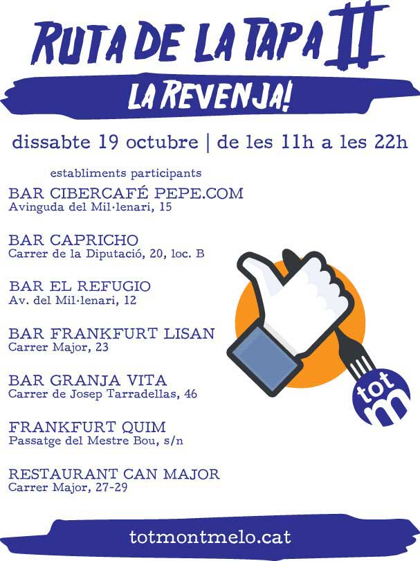 Veient la resposta que varem tenir a la 1º ruta de la tapa del totmontmelo.cat, ens fa molta il·lusió presentar-vos, la ruta de la tapa 2, la revenja!, l'activitat tindrà el mateix funcionament que la primera edició i serà el dissabte 19 d'octubre de les 11h a les 22h. Els establiments participants d'aquesta edició són: BAR CIBERCAFÉ PEPE.COM Avinguda del Mil·lenari, 15 BAR ...