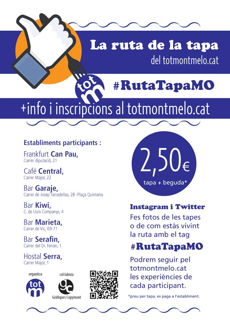 L'equip del totmontmelo.cat estem molt contents d'organitzar la 1era Ruta de la Tapa.   Serà el dia 22 de Juny de 11h a 22h. El bars participants oferiran una tapa acompanyada d'una beguda per 2,5€, el pagament es farà directament als bars participants, en el moment de consumir la tapa.    Per poder asegurar l'assistència als bars, requerim una inscripció. És molt ...