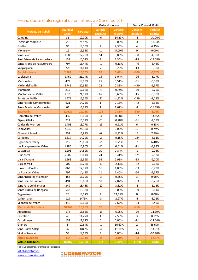 Observatori del Vallès Oriental: Avanç de dades d\'atur registrat durant el mes de gener de 2014 al Vallès Oriental