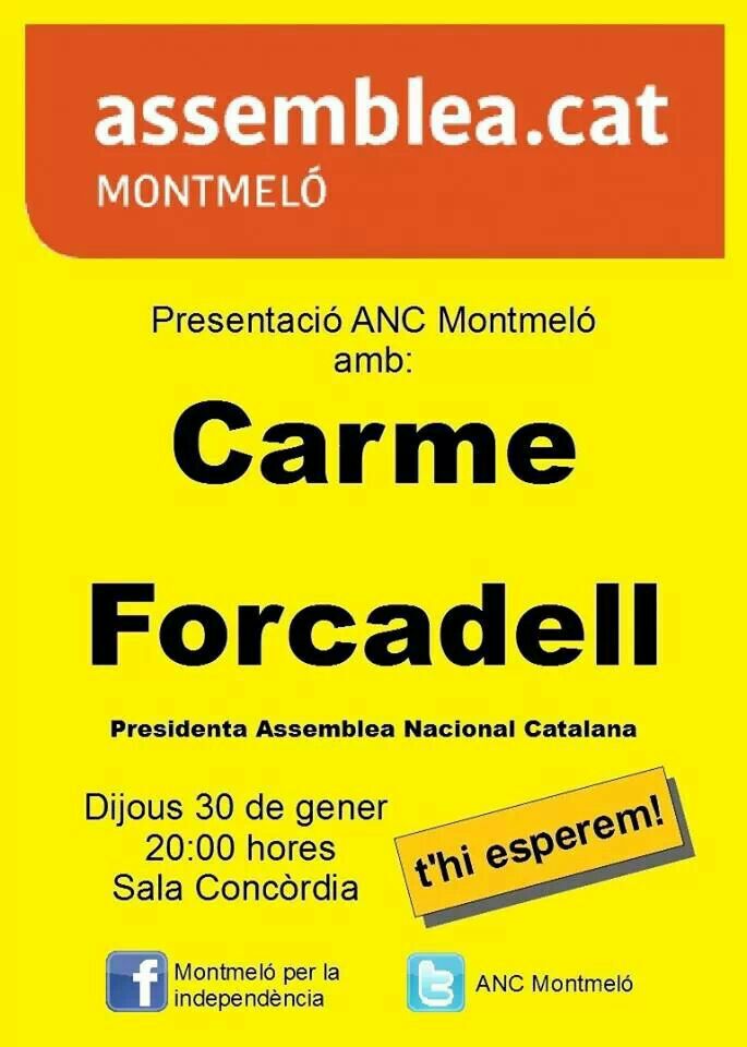 Dijous 30 de gener es realitzarà la presentació de l' ANC Montmeló amb la participació de Carme Forcadell presidenta de l'Assemblea Nacional Catalana. L'acte tindrà lloc a dijous 30 de gener a les 20h a la Sala ...